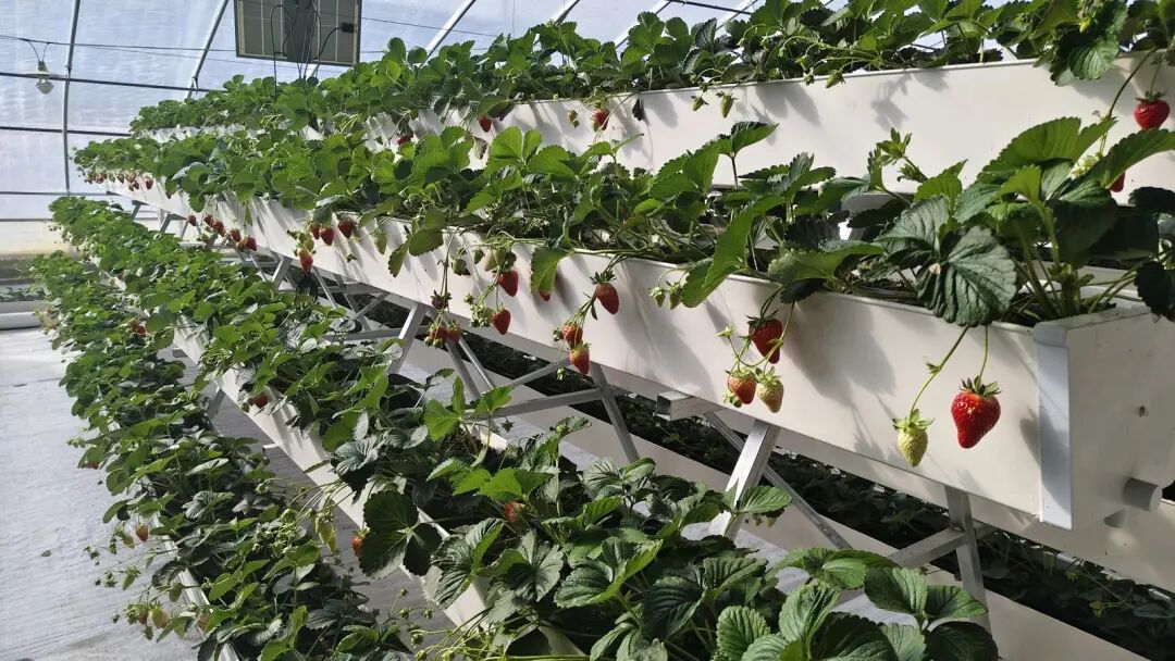 深冬时节,寒意渐浓,而临夏县土桥镇辛付村的日光温室基地内却暖意融融、果香四溢。作为全县首家采用新型无土栽培技术的草莓种植基地,这里的高架基质栽培大棚里,妙香7号、章姬、红颜、红玉、粉玉等多个优质草莓品种陆续成熟上市,一颗颗饱满鲜红的果实垂挂于立体栽培架上,散发着诱人甜香,为冬日增添了别样“莓”好。