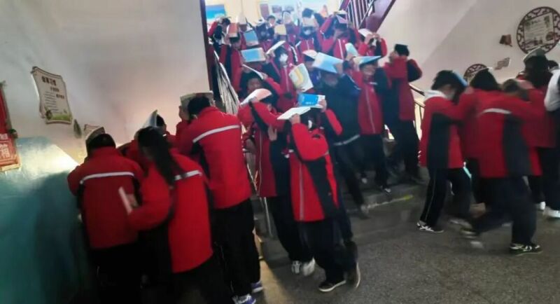 随着演练信号的发出,地震应急演练正式启动。在老师们的有序引导下,同学们迅速反应、规范操作,双手抱头、屈膝弯腰,快速躲在课桌下方,充分利用课桌进行避险缓冲;随后,同学们弯腰低姿、快速有序撤离,不推挤、不慌乱,稳步前往校园指定安全区域。整个疏散过程紧张有序、衔接顺畅,展现了全体师生良好的应急素养和协同配合能力。到达安全区域后,各班主任第一时间清点人数并逐一向现场指挥人员上报,确保无一人遗漏。