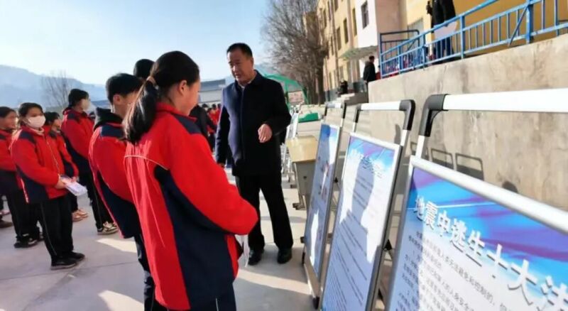 演练结束后,县地震局工作人员结合校园安全实际,带领同学们参观地震安全知识展板,通过直观生动的图文讲解,向同学们普及地震形成原因、常见前兆、室内外避险要点及灾后自救互救等核心知识,让抽象的安全知识变得通俗易懂。同时,工作人员还为同学们发放地震安全知识手册,鼓励大家课后认真研读、互相交流,进一步巩固避险知识。