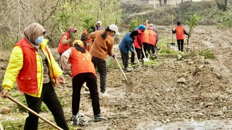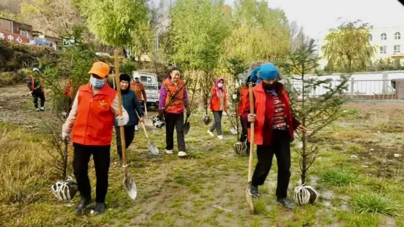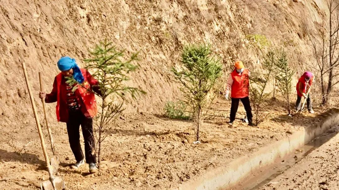 在井沟乡大路村植树点,乡村干部、党员群众、志愿者分工协作,挥锹挖坑、扶正树苗、培土浇水,每一道工序都一丝不苟。跃动的“志愿红”与新栽的“幼苗绿”交织在一起,构成了一道亮丽的风景线。