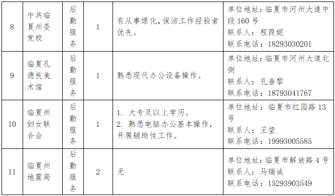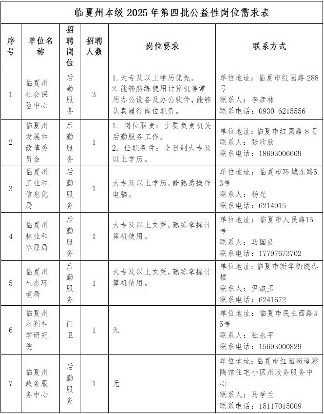 3.联系人:各机关事业单位联系人(详见临夏州本级2025年第四批公益性岗位需求表)