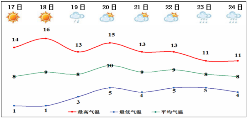 未来一周前期天气晴好,后期多阴雨天气。具体预报:17日11:00~19日07:00全州晴间多云;19日07:00~20日07:00全州多云有零星小阵雨(海拔较高山区零星雨夹雪);20 日07:00~23 日 07:00 全州多云间晴;23 日 07:00~24 日 20:00全州阴有小雨(海拔较高山区小雨夹雪)。周内全州最低气温1℃左右,最高气温 16℃左右。