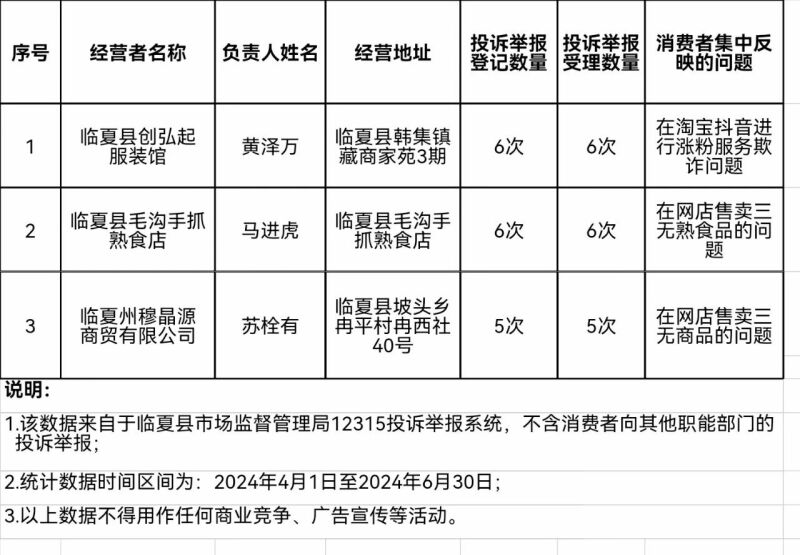 临夏县2024年第二季度12315平台消费投诉信息公示